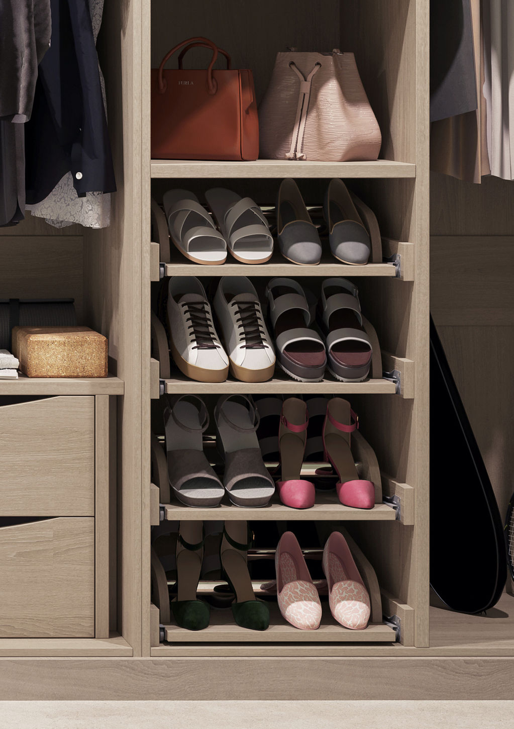 Beautiful inside and out, our wardrobes are easy to personalise with soft-close drawers, hanging rails, open shelving, and slide-out footwear storage to achieve a clutter-free, organised feel.