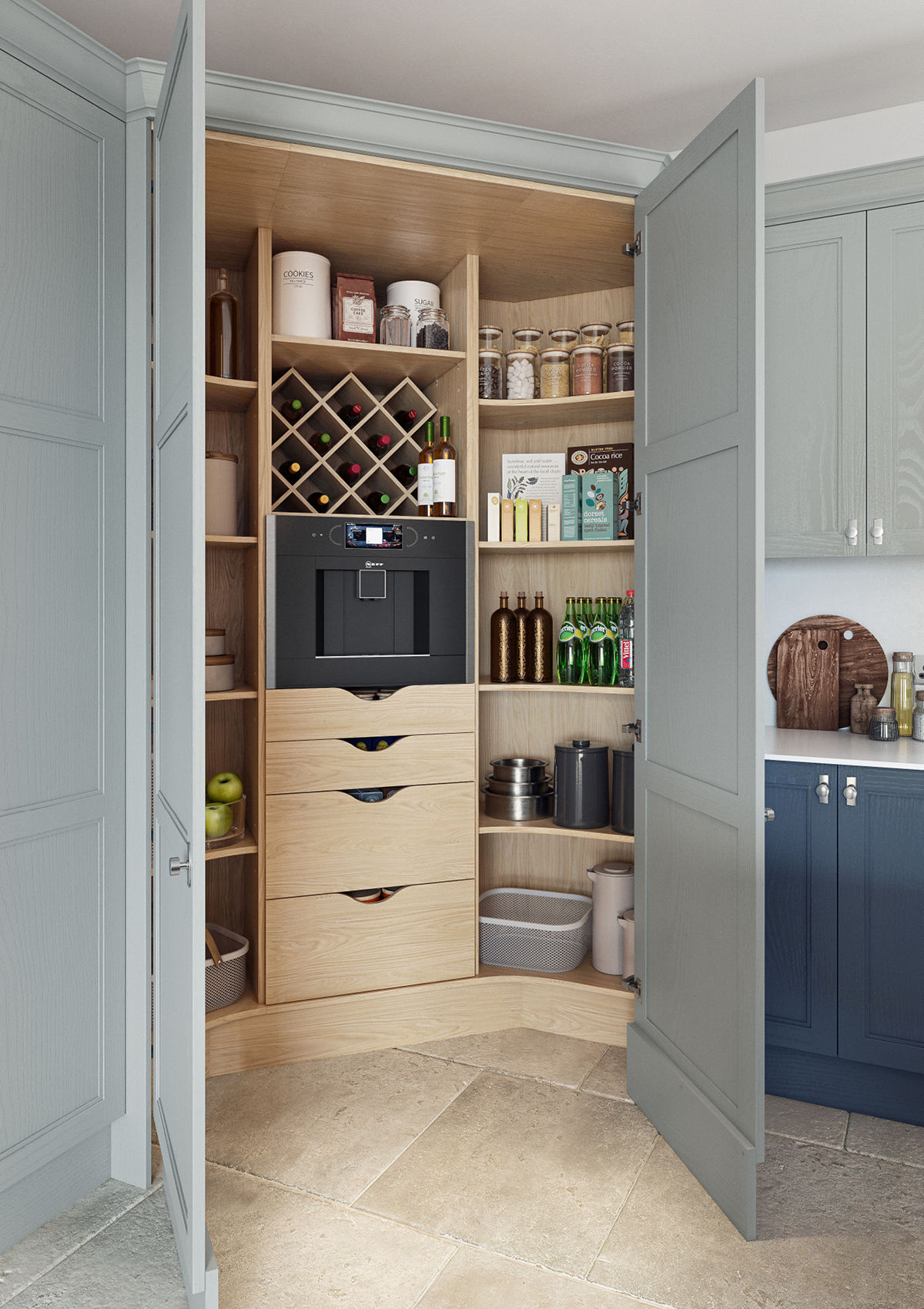 The flexible layout also offers the opportunity to elevate the kitchen by incorporating a compact appliance, such as a coffee machine to achieve a seamless clutter free feel. The walk-in-pantry is available across all our kitchen ranges.